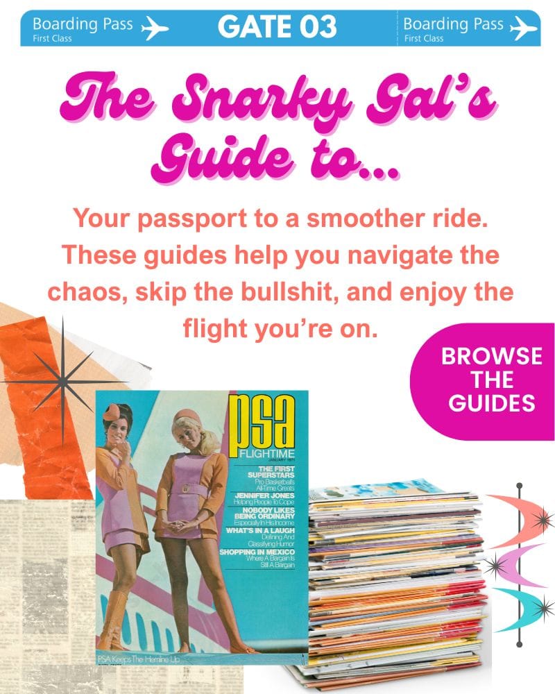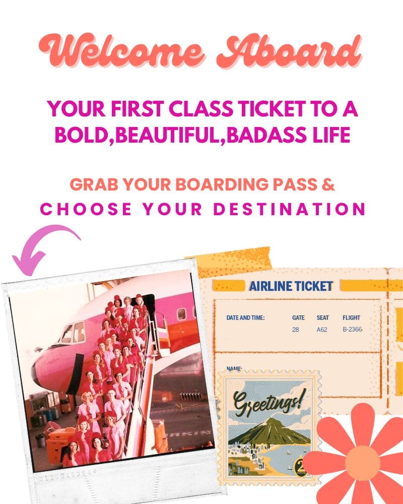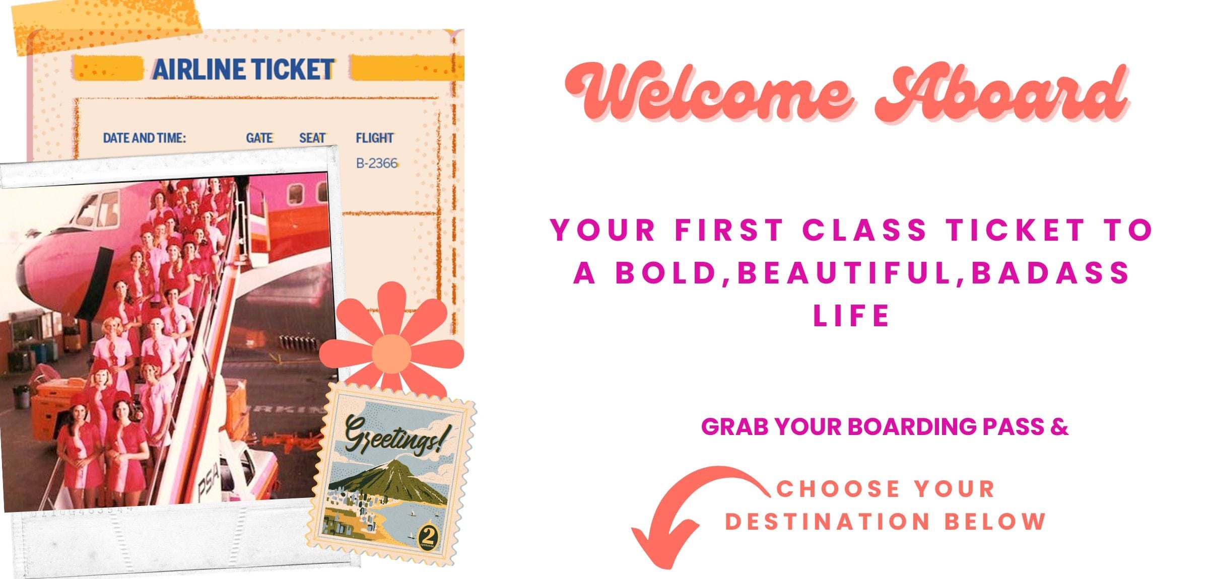 Our flight today is nonstop service to a bold, beautiful, badass life — no layovers in Drama City, no detours into BS. I’ll be your pilot, your co-pilot, and sometimes your in-flight cocktail waitress, here to help you ditch the baggage and chart a course you actually want to follow.